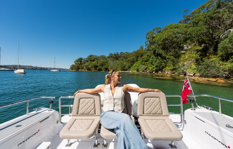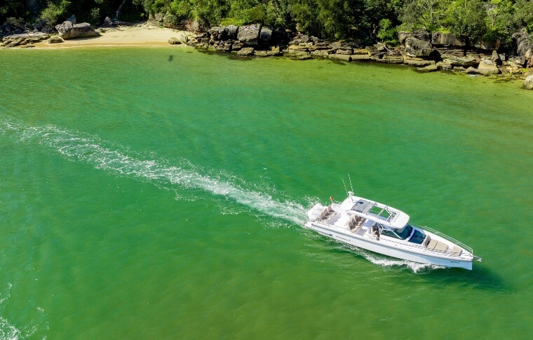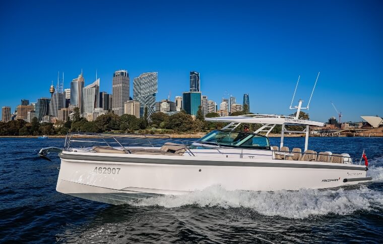 Spectre: Our elegant Axopar 37’ open-top sports cruiser is sleek and fast, with a touch of Italian Riviera styling. Spectre won 2017 European Sports Boat of the Year and is perfectly suited to Sydney Harbour waters. The boat seats 10 (plus skipper) and is equipped with ample shade, downstairs bedroom, kitchenette and toilet facilities, generous food and drink storage and plenty of space for lounging in the sun and moving about the boat.Your Boat